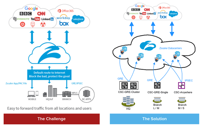 The Cloud Security Connectors (CSC) family covers all scenarios for Zscaler: From a Small Branch using a cheap broadband internet link to a High End location with speed requirements up to 1 Gbps and full High Availability.