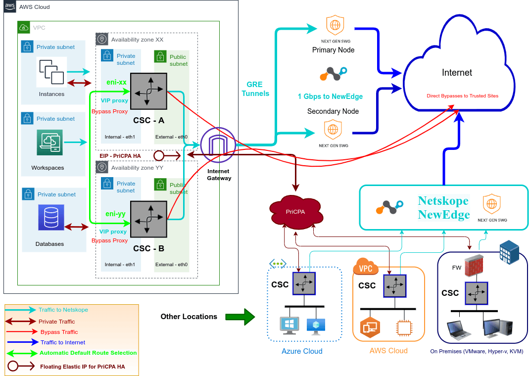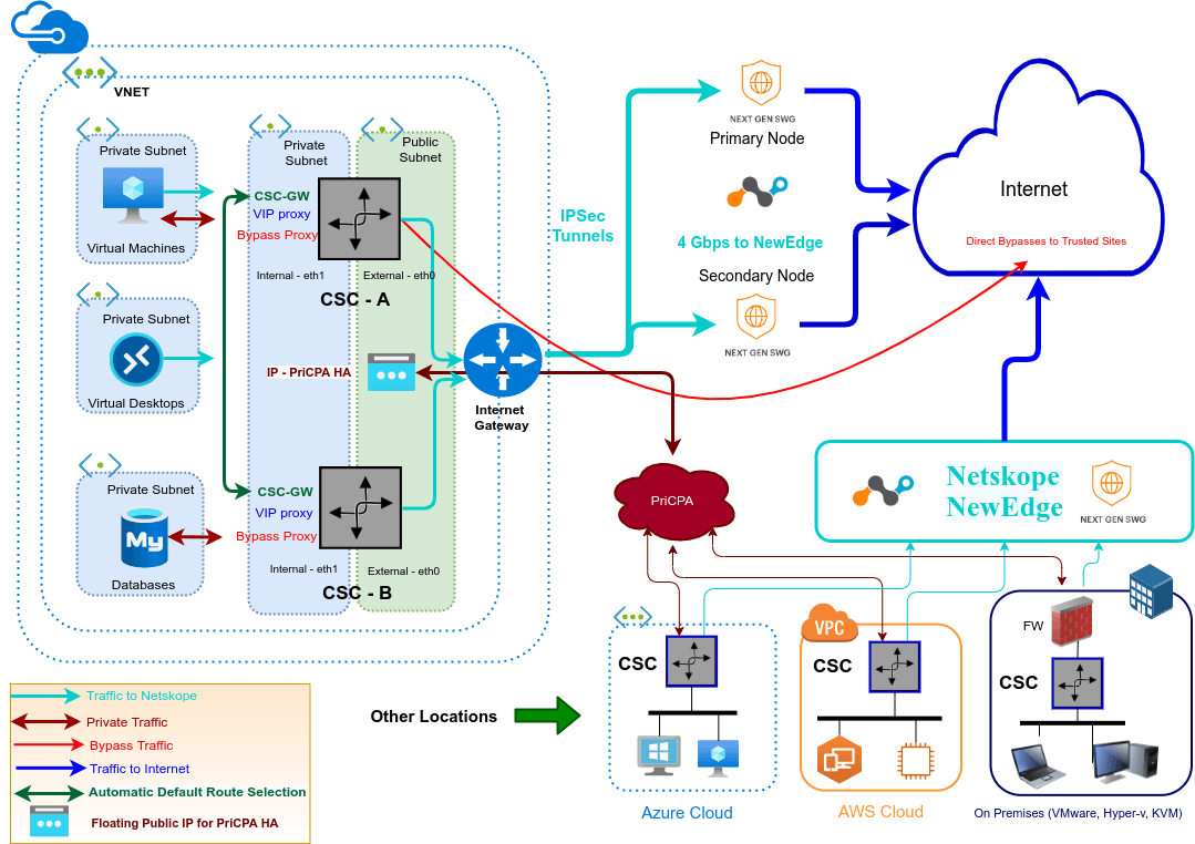 - All Netskope functionalities are available, providing complete visibility of all Internet traffic.In addition to this, the CSC provides high availability changing the default route to Netskope when configured as High Availability pair, and an easy way to manage direct bypasses to trusted sites using your public IP.